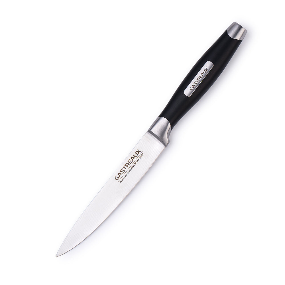 The Gastreaux Essential Knife is expertly crafted and tailored for households in Asia. Its stainless steel construction, in one seamless piece, guarantees durability and eliminates the risk of the blade separating from the handle. This versatile knife is perfect for slicing, dicing, cutting, and carving. Boasting precise and accurate fine-edged blades, coupled with soft-touch handles for comfort and control, it is a must-have for everyday use. After each use, simply hand wash the knife for a clean, professional cut. The sleek stainless steel and black handle design adds a touch of sophistication to any kitchen. With user safety in mind, the handle is coated with ABS for a secure grip. Additionally, it comes with a sleek revolving block for stylish and safe storage. The blade material is stainless steel 3cr14, while the handle is a combination of ABS and stainless steel 430. We guarantee that the Gastreaux Essential Knife is a practical and essential tool for all your cutting needs.